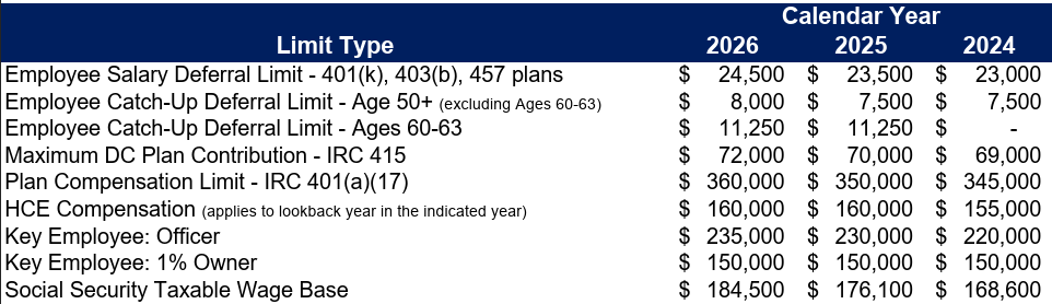 On November 13, 2025, the IRS released cost-of-living adjustments for various retirement plan limitations that will take effect on January 1, 2026. We have presented a few of the more important plan limits below. For more information, please contact us at 1-800-594-7700.